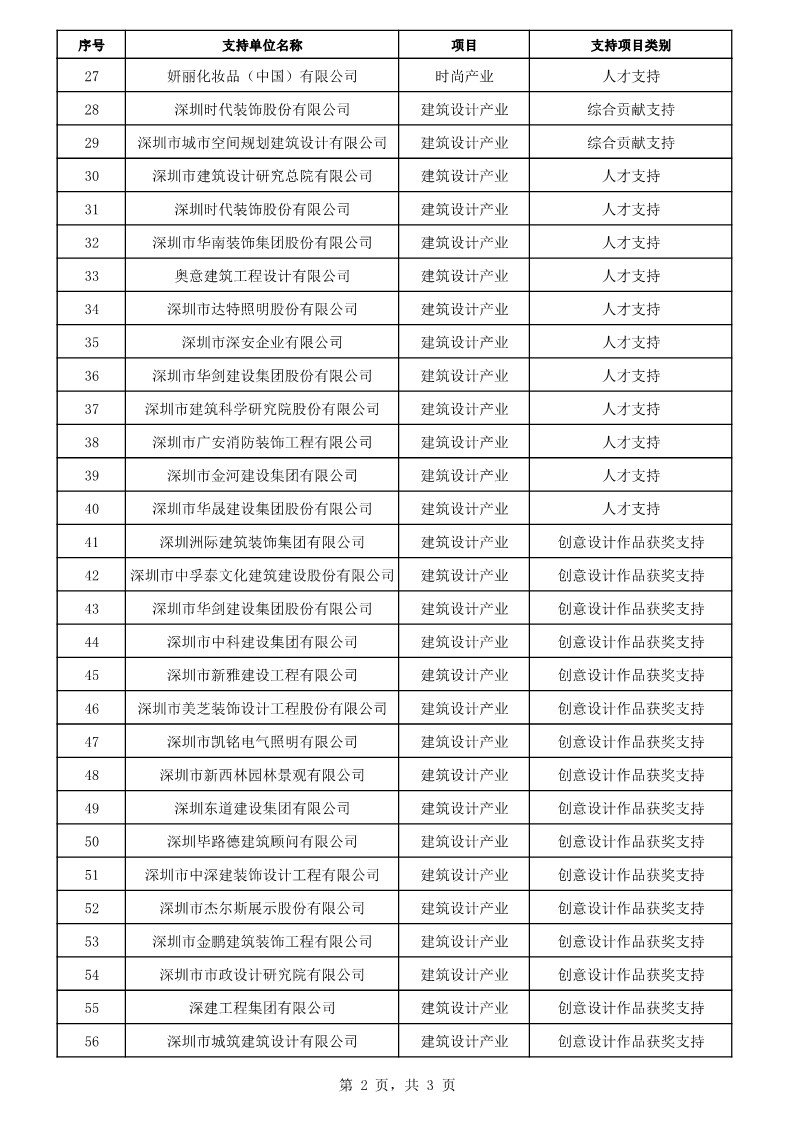 2020年3月24日,福田企服中心公布了2019年福田區產業發展專項資金文化旅游體育產業、時尚產業、建筑裝飾設計產業分項第七批支持企業及項目匯總表。其中,深圳市華南裝飾集團股份有限公司、深圳市華劍建設集團股份有限公司、深圳市廣安消防裝飾工程有限公司、深圳洲際建筑裝飾集團有限公司等建筑裝飾設計企業獲得該項資金支持,支持項目類別有:綜合貢獻支持、創意設計作品獲獎支持、人才支持、企業支持認定支持。