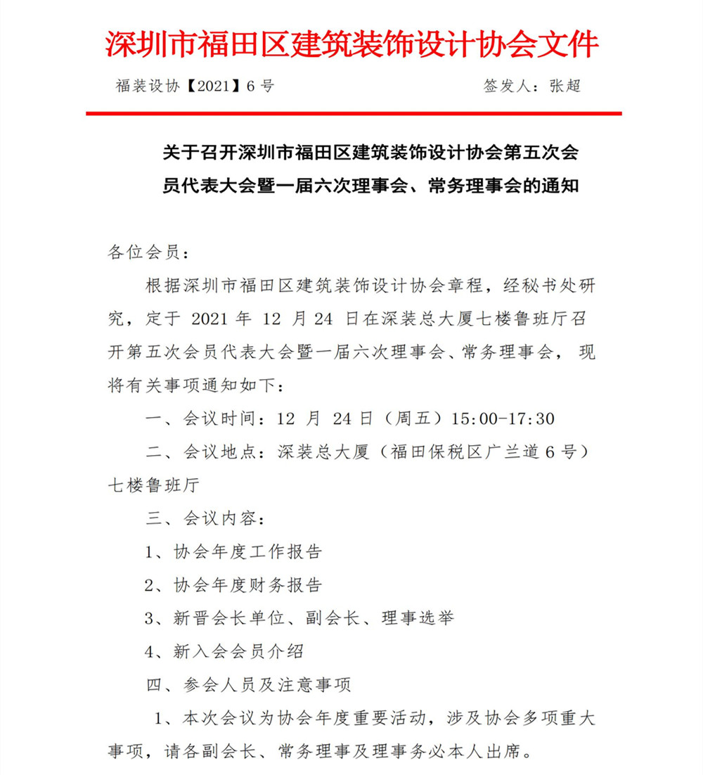 關(guān)于召開深圳市福田區(qū)建筑裝飾設(shè)計協(xié)會第五次會員代表大會暨一屆六次理事會、常務(wù)理事會的通知